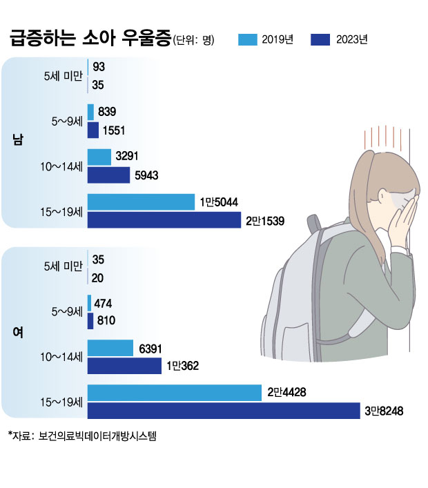 과연 소아우울증이 얼마나 많이 늘었을까. 건강보험심사평가원의 보건의료빅데이터개방시스템에 따르면 15~19세 남학생의 우울증 진단 건수는 2019년 1만5044명에서 2023년 2만1539명으로 43.2%포인트, 여학생은 2만4428명에서 3만8248명으로 56.6%포인트 늘었다. 서울대어린이병원 소아정신과 김재원 교수는 이처럼 소아우울증이 급증한 원인으로 "한국에선 어릴 때부터 학업 등의 이유로 스트레스에 많이 노출되기 때문일 것"이라고 분석했다.