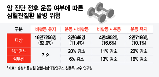 그 결과 규칙적인 운동을 암 진단 전후 모두 유지한 경우 심근경색 위험이 20%, 심부전 위험이 16% 감소했다. 또 암 진단 전에 운동을 안 했더라도 암 진단 후 운동을 새로 시작한 경우 심근경색 위험이 11%, 심부전 위험이 13% 낮았다.