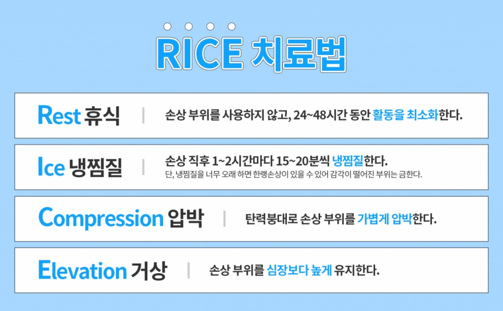 RICE 치료법은 △통증을 감소시키는 Rest(안정) △부종을 줄이는 Ice(얼음) △손상 부위를 탄력붕대로 가볍게 감싸는 Compression(압박) △중력을 이용해 출혈 등을 줄이는 Elevation(거상)을 뜻한다. 손상 후 24시간 이내로 RICE 치료를 적용하면 회복 기간을 크게 줄일 수 있다. 빠른 치료로 부종·염증을 최소화하고 추가적인 손상을 막을 수 있어 빠른 회복을 돕는다.
