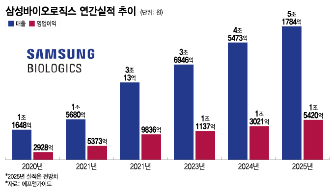 22일 업계에 따르면 삼성바이오로직스는 올해부터 가동되는 5공장과 항체-약물접합체(ADC) 전용 생산시설 등을 통해 실적 성장세를 이어갈 전망이다. 지난해 사상 최대 실적 경신 배경이 4공장 매출 상승을 바탕으로 한 압도적 생산능력에 있는 만큼, 생산력 추가 확대를 통해 올해 5조원대 매출 달성이 낙관된다.