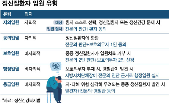 기존엔 ▶환자가 입원 치료를 받아야 할 정도로 중증 정신질환이 있거나(입원 치료 필요성) ▶환자 자신 또는 타인의 안전에 해를 끼칠 수 있는 경우(자·타해 위험성) 가운데 둘 중 하나만 만족해도 보호자가 환자를 입원시킬 수 있었다. 한양대병원 정신건강의학과 이건석 교수는 "이렇게 둘 중 하나만 만족해도 입원 치료가 가능한 건 세계적 흐름"이라고 설명했다.
