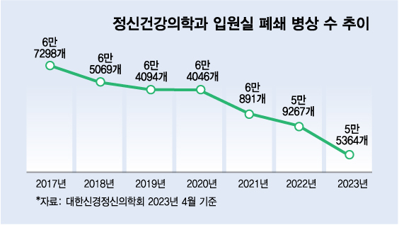정신질환을 치료할 때 수술 없이 약물 투여만 이뤄지는데, 입원료가 싼 우리나라의 경우 병원 입장에선 환자가 오래 입원한다고 해서 돈을 벌 구조가 아니라는 것이다. 반면 미국은 병실료·약값·상담료·처치료 등을 포함해 1주일간 입원 치료를 받는 데 100만~1000만원선으로, 우리보다 최대 100배 차이가 난다는 게 그의 설명이다. 실제로 대한신경정신의학회에 따르면 정신건강의학과 입원실 폐쇄 병상 수는 2017년 6만7298개에서 2023년 4월 5만5364개로 줄었다.