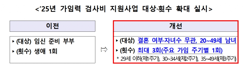 지난해 사업 첫해엔 13만여명의 남녀가 가임력 검사비 지원을 신청한 것으로 집계됐다. 첫해엔 부부(사실혼·예비부부 포함) 대상으로 평생 1회 지원하던 것을 올해부터는 혼인상태 무관, 평생 3회(주요 주기별 1회)로 확대했다. 이에 지난 1~2월 두 달 만에 9만4000여명이 지원을 신청하는 등 주목받고 있다.