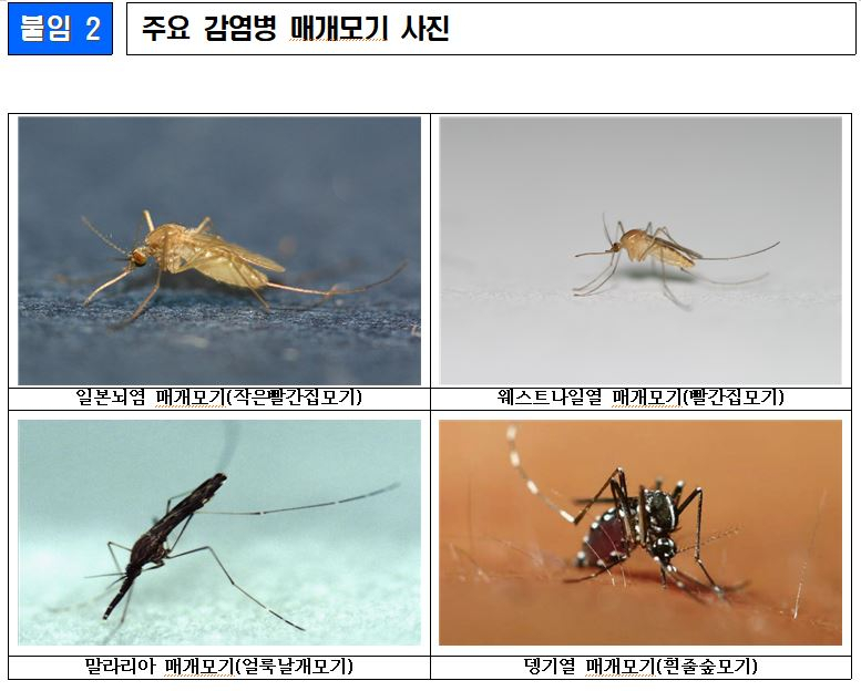 모기가 전파하는 주요 감염병은 일본뇌염, 말라리아, 뎅기열, 황열, 지카바이러스 감염증, 웨스트나일열 등이다. 이들 감염병을 매개할 수 있는 모기는 전국적으로 서식하고 있다.