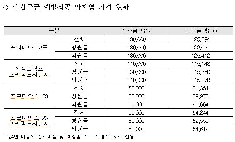2024년 비급여 가격(진료비용) 조사·분석 결과, 폐렴구균 예방접종은 약제 종류에 따라 평균 가격에 다소 차이가 있었으며 프리베나13주, 신플로릭스 프리필드시린지 등 단백결합백신(PCV)이 프로디악스-23, 프로디악스-23 프리필드시린지 등 다당질백신(PPSV)보다 평균 가격이 약 2배가량 높은 것으로 나타났다.