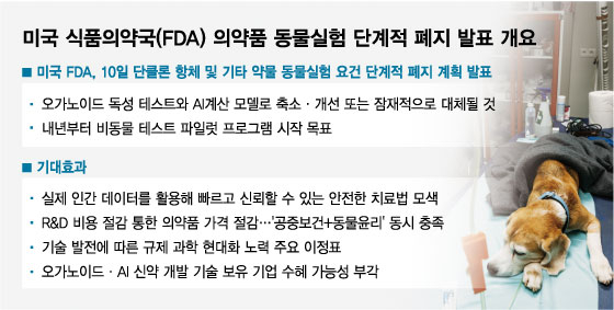 미국 FDA는 지난 10일 의약품 개발을 위한 동물실험이 오가노이드 독성 테스트와 인공지능(AI) 기반 계산 모델 등을 통해 축소·개선되거나 잠재적으로 대체될 것이라고 밝혔다. 아직 세부 지침이 나온 것은 아니지만, 내년부턴 비동물 기반 테스트 전략을 사용할 수 있도록 파일럿 프로그램을 시작하는 것이 목표다.