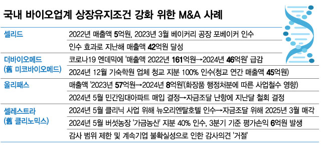바이오 기업의 선뜻 이해하기 어려운 인수합병은 대체로 매출액 요건 등 상장 유지 조건을 충족하기 위해 이뤄진다. 하지만 이 같은 선택이 항상 좋은 결과로 이어지진 않는다. 일부 기업은 투자 과정에서 꼼꼼하게 점검하지 못하고 외부 기업을 인수했다가 기대한 효과를 보지 못하기도 한다. 자금만 허비한 꼴이다.