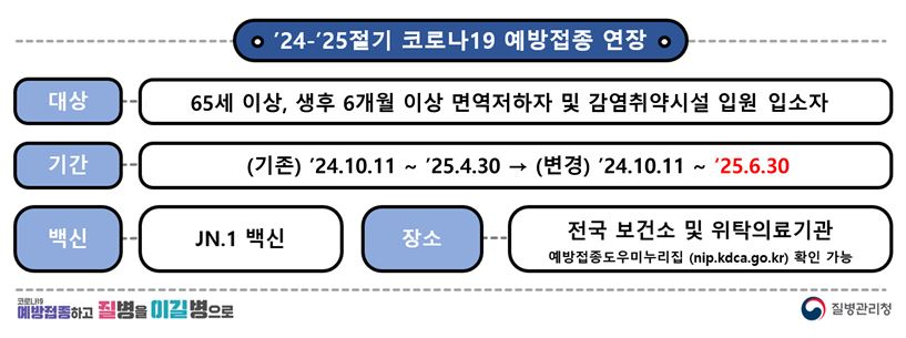 질병관리청이 당초 4월30일 종료 예정인 고위험군 대상 2024~2025년 절기 코로나19 예방접종을 6월30일까지로 연장한다고 22일 밝혔다.