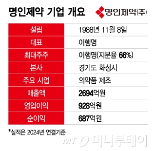 명인제약의 최대주주는 이행명 회장이다. 이 회장의 특수관계인을 포함한 최대주주 측 지분율은 95.3%다. 사실상 개인회사로, 그동안 외부 투자를 거의 받지 않은 것으로 풀이된다.