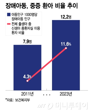 그러면서 전체 아동 인구 중 장애아동 인구 비율이 크게 늘었다. 아동 인구 1000명당 장애아동 인구는 2011년 7.9명에서 2023년 12.2명, 2024년 13.1명으로 증가했다.