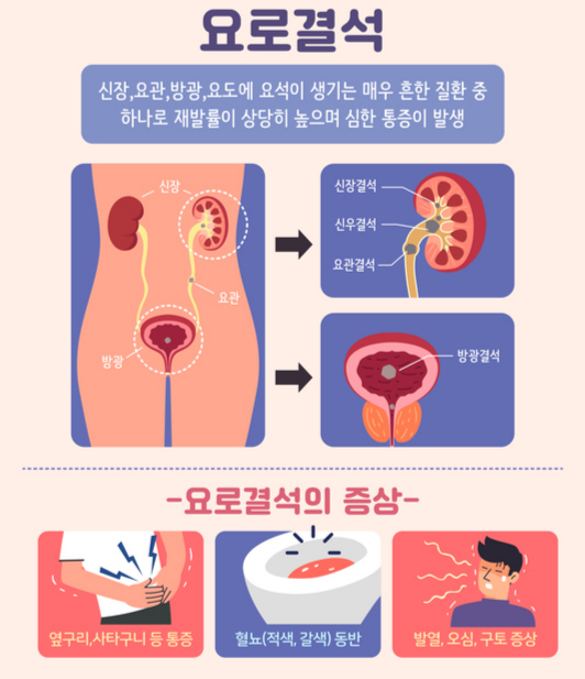 요로결석은 소변이 나오는 길(요로) 중 어느 부위에 발생했는지에 따라 △신장결석 △요관결석 △방광결석 △요도결석으로 구분된다. 통증이 극심하기로 유명한데, 보통 옆구리·복부에 칼·송곳으로 찌르는 듯한 격렬한 통증을 유발하며 진통제로도 쉽게 진정되지 않는다. 심하면 아랫배로 통증이 퍼지며, 혈뇨·탁뇨·빈뇨가 동반될 수 있다.