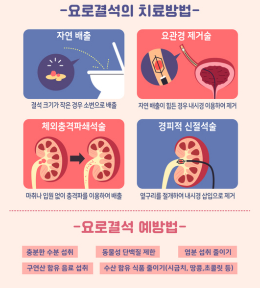 요로결석 치료는 크게 세 가지로 나뉜다. 5㎜ 미만의 작은 결석은 다량의 수분 섭취나 약물로 배출을 촉진할 수 있다. 그러나 결석 크기가 10㎜ 이상이거나 발생 위치가 상부 요관이면 자연 배출을 기대하기 어려워 시술·수술적 치료가 필요하다. '체외충격파 쇄석술'은 외부에서 발생시킨 충격파를 결석에 집중시켜 체내에서 결석을 분쇄해 배출하는 시술이다. 마취·입원이 필요 없어 환자의 부담이 적다. 수술적 치료는 내시경을 이용해 결석을 레이저로 없애는 '요관경 결석 제거술'이 대표적이다.