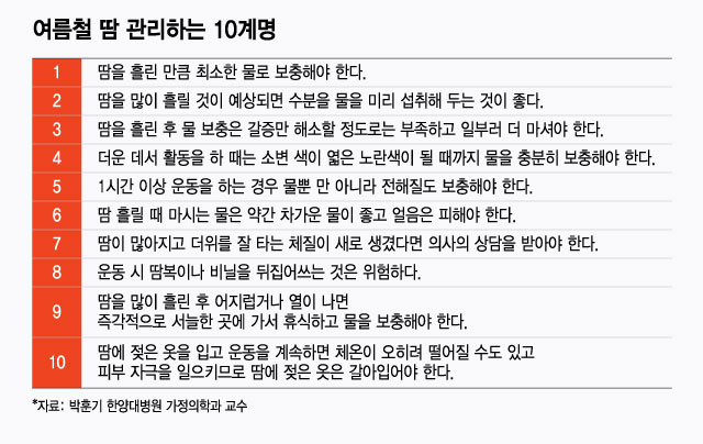 땀을 흘렸을 때 목이 많이 마르지 않아도 탈수가 심할 수 있으므로 갈증 여부와 상관없이 물을 자주 마시는 게 좋다. 김선미 고려대 구로병원 가정의학과 교수는 "간혹 탈수를 막기 위해 소금을 먹는 경우가 있는데, 소금을 따로 먹는 건 좋지 않다"며 "소금을 배설하기 위해 소변으로 더 많은 물이 빠져나가 탈수가 심해지기 때문"이라고 말했다.