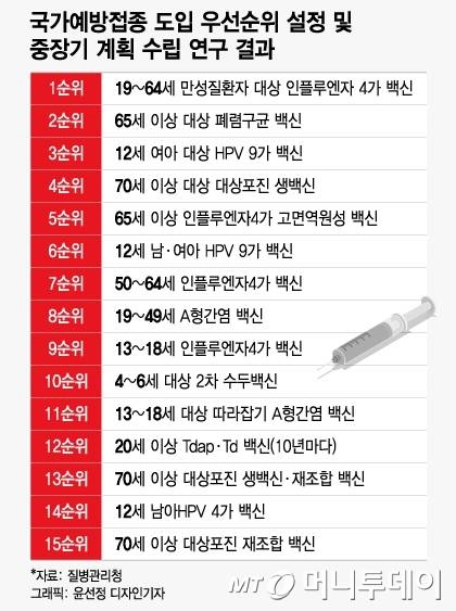 질병청이 지난해 1월 공개한 '국가예방접종 도입 우선순위 설정 및 중장기 계획 수립'에서도 9가 HPV 백신 접종 도입의 우선순위가 4가 HPV 백신보다 더 높았다. 3순위가 12세 여아 대상 HPV 9가 백신, 6순위가 12세 남·여아 HPV 9가 백신, 14순위가 12세 남아 HPV 4가 백신이었다.