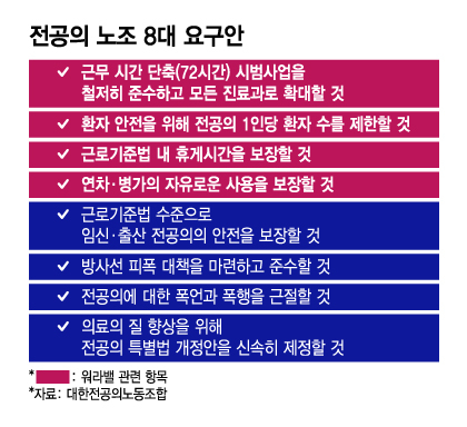 전날(14일) 발대식과 함께 공식 출범한 대한전공의노동조합(전공의노조)은 "전공의 혹사의 대를 끊고 무너지는 의료를 바로잡고자 노동조합을 설립했다"며 '8대 요구안'을 발표했다. 그중 △모든 진료과 근무 시간 72시간으로 단축 △전공의 1인당 환자 수 제한 △근로기준법 내 휴게시간을 보장 △연차·병가 자유로운 사용 보장 등 '워라밸'(일과 삶의 균형) 관련 항목이 절반(4개)에 달한다.