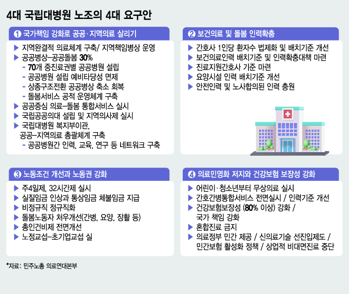 이날 전국민주노동조합총연맹(민주노총) 산하 의료연대본부 소속 서울대·강원대·경북대·충북대병원 노조는 기자회견에서 "지역·공공의료가 무너져가는데도 이재명 정부 국정과제엔 지역·공공의료를 강화할 구체적인 실행계획도 없고 예산도 없는 공허한 대책"이라며 "구체적인 대책을 내놓지 않으면 오는 24일부터 전면 무기한 파업에 돌입하겠다"고 밝혔다.