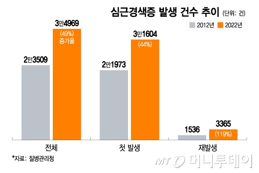 특히 심근경색 재발건수 증가율이 급등했다. 2022년 심근경색 첫 발생건수는 3만1604건으로 10년 전보다 44% 늘었는데 2022년 심근경색 재발생건수는 3365건으로 10년 전 대비 증가율이 119%에 달했다.