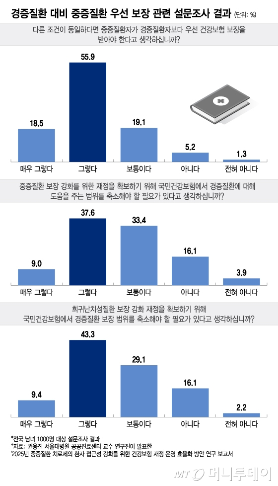 권용진 서울대병원 공공진료센터 교수가 최근 발표한 '2025년 중증질환 치료제의 환자 접근성 강화를 위한 건강보험 재정 운영 효율화 방안 연구 보고서'에 따르면 대한민국 20세 이상 남녀 1000명을 설문조사한 결과 '다른 조건이 동일하다면, 중증질환자가 경증질환자보다 우선 건강보험 보장을 받아야 한다고 생각하십니까?'라는 질문에 74.4%가 그렇다고 답했다. 18.5%는 매우 그렇다, 55.9%는 그렇다고 했다. 동의하지 않는다는 대답은 6.5%에 불과했다.