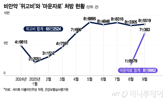 14일 국회 보건복지위원회 소속 서미화 더불어민주당 의원이 건강보험심사평가원으로부터 제출받은 DUR(의약품안전사용서비스) 시스템을 통해 전송이 완료된 입원·외래 DUR 처방점검 완료 비만약 처방전수 산출자료에 따르면 지난달 마운자로 처방량은 7만383건으로 출시 달인 지난 8월 1만8579건 대비 279%(5만1804건) 급증했다.
