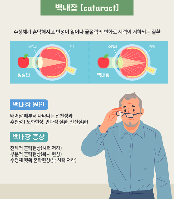 백내장은 눈 속 투명한 수정체가 혼탁해지면서 빛이 제대로 통과하지 못해 시력이 점차 떨어지는 질환이다. 백내장은 노화가 주된 원인이며, 노화 외에도 자외선 노출, 흡연, 당뇨병, 고도 근시, 스테로이드 등 특정 약물이 발생에 영향을 미친다고 알려져 있다.
