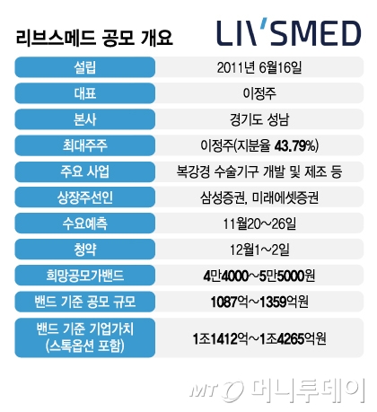 리브스메드는 희망공모가밴드로 4만4000~5만5000원을 제시했다. 밴드 기준 공모 규모는 1087억~1359억원이다. 예상 기업가치(스톡옵션 등 포함)는 1조1412억~1조4265억원이다. 내달 20~26일 기관투자자 대상 수요예측을 거쳐 다음 달인 12월 1~2일 일반투자자 청약을 진행한다.