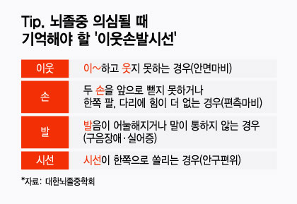 뇌졸중 증상은 갑자기 발생하게 되는데, 뇌졸중 의심 증상은 대표적으로 안면마비, 발음장애, 편측마비, 실어증, 안구편위, 시야장애, 중심을 잡지 못할 정도의 심한 어지럼증, 심한 두통 등이 있다. 따라서 평소에 '이웃손발시선'(Tip 참조)을 기억하는 것이 중요하다. ▶이~하고 웃지 못하는 경우(안면마비) ▶두 손을 앞으로 뻗지 못하거나 한쪽 팔·다리에 힘이 더 없는 경우(편측마비) ▶발음이 어눌해지거나 말이 통하지 않는 경우(구음장애·실어증) ▶시선이 한쪽으로 쏠리는 경우(안구편위) 뇌졸중을 의심해야 한다.