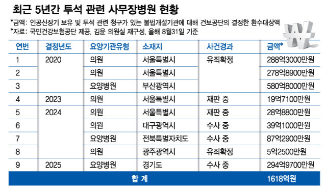 실제 더불어민주당 김윤 의원이 건보공단으로부터 제출받은 '투석 관련 사무장병원 현황' 자료에 따르면, 2020년 1월부터 올해 8월까지 투석 관련 의료기관 9곳이 사무장병원 개설·운영 혐의로 수사·재판 중이거나 처벌받았는데, 이들 사무장병원에 대해 건보공단이 결정한 요양급여비 환수대상액은 1623억원에 달했다.