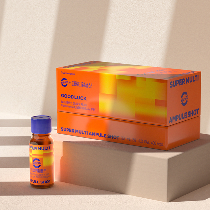 비타500 수퍼멀티앰플샷은 비타민C 1000mg(1일 영양성분 기준치 1000%)을 포함해 10종의 비타민과 미네랄을 함유한 제품이다. 비타민A, 비타민B군, 비타민D, 나이아신, 비오틴, 아연 등이 성인 1일 영양성분 기준치 100%를 충족해 하루 한 병으로 균형 잡힌 영양 섭취가 가능하도록 설계됐다.