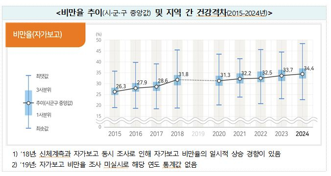 지역별로 비만율이 가장 높은 시·도는 전남(36.8%)과 제주(36.8%)였다. 가장 낮은 시‧도는 세종(29.1%)이었다. 10년 전 대비 전국 17개 모든 광역시도에서 비만율이 증가했다. 이 중 전남은 11.4%포인트(p) 상승하며 가장 큰 증가폭을 보였다. 세종은 2.9%포인트 증가에 그쳐 가장 완만한 상승세를 나타냈다.