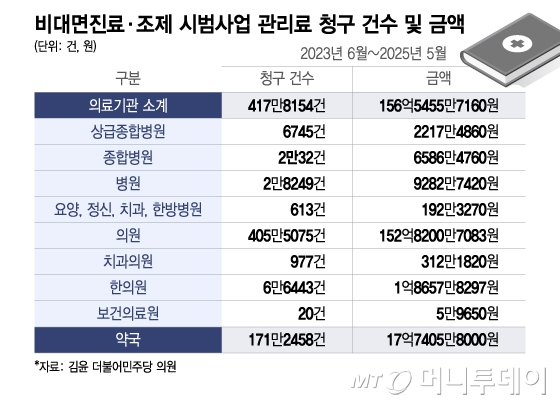 11일 국회 보건복지위원회 소속 김윤 더불어민주당 의원이 보건복지부로부터 입수한 '비대면진료·조제 시범사업 관리료 청구건수 및 금액' 자료에 따르면 비대면진료 시범사업이 시작된 2023년 6월부터 올해 5월까지 비대면진료·조제시범사업 관리료로 청구된 금액은 174억2861만5000원이었다.