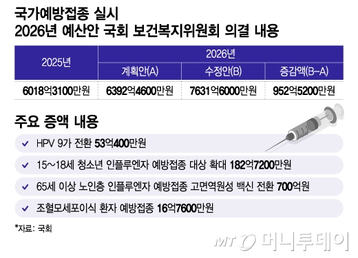 13일 국회에 따르면 복지위는 전날 보건복지부·식품의약품안전처·질병관리청 소관 2026년도 예산안과 기금운용계획안을 심사한 뒤 표결했다. 복지위는 질병관리청 예산을 기존 예산안 대비 2306억6700만원 증액했는데, 이 중 952억5200만원이 국가예방접종 사업 예산 증액분이다.