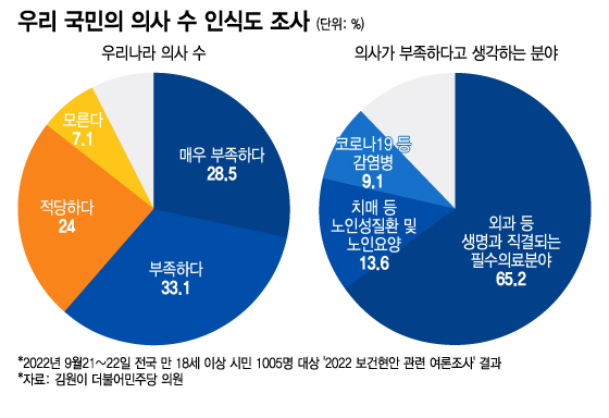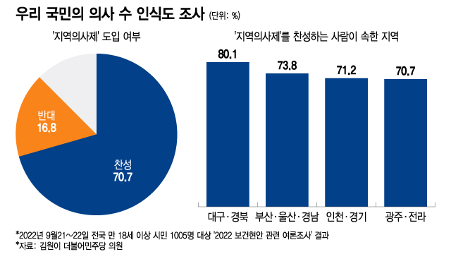 일단 '민심'을 살펴보면 우리 국민 10명 중 7명은 지역의사제에 찬성하는 것으로 나타났다. 앞서 2022년 보건복지위 국정감사에서 김원이 더불어민주당 의원이 발표한 '2022 보건현안 관련 여론조사' 결과에 따르면, 우리 국민 1005명을 대상으로 한 설문조사에서 '지역의사제' 도입에 대한 질문에 응답자의 70.7%가 찬성 의견을 표시했다. 반대는 16.8%로 집계됐다.