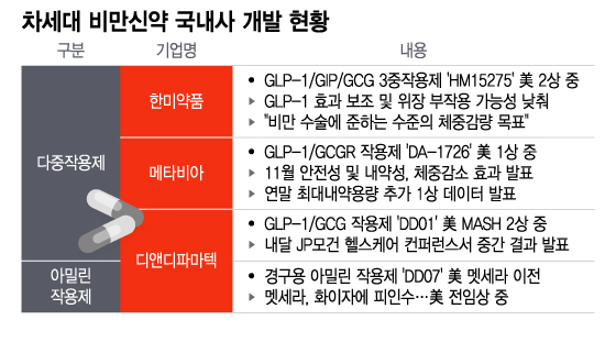 위고비·젭바운드의 성공을 통해 비만신약 가치를 실감한 국내사 역시 해당 분야에서 속도를 내고 있다. 아밀린 수용체 파이프라인 이전에 성공한 디앤디파마텍과 다중작용제 분야 강점을 보이는 한미약품, 메타비아가 대표 주자다.
