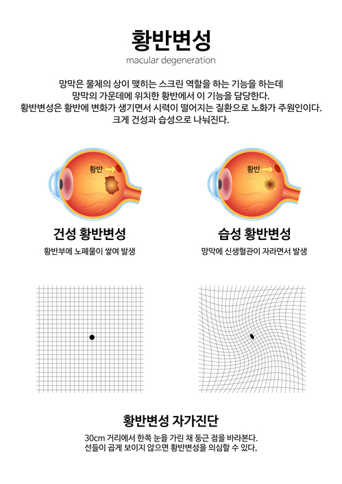 망막 중에서도 시세포가 가장 많이 모인 곳이 황반(黃斑)이다. 황반의 구조가 바뀌고 황반 기능이 이상을 일으키는 질환이 '황반변성'이다. 50세 이상 연령대에서 글자·사물이 구부러져 보이거나, 중심 시야의 일부가 보이지 않는 암점이 생기면 황반변성을 의심할 수 있다.