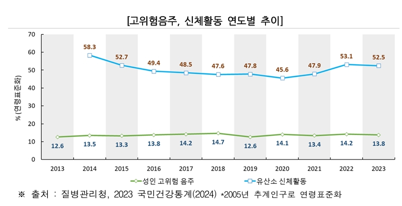 19세 이상 성인의 '고위험 음주율'(최근 1년간 1회 평균 음주량이 남자 7잔 이상, 여자 5잔 이상이며 주 2회 술 마시는 분율)은 2023년 13.8%로 지난 10년간(2013~2023년) 12~14%로 정체했다.