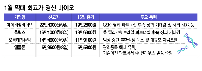 연초 국내 주요 바이오 기업들의 최고가 경신이 이어지고 있다. 지난해 대형 글로벌 기술이전으로 높은 기업가치 상승률을 기록한 에이비엘바이오와 올릭스가 상승세를 타고 있고, 기존 악재에 주춤했던 오름테라퓨틱과 앱클론은 반등에 성공했다.