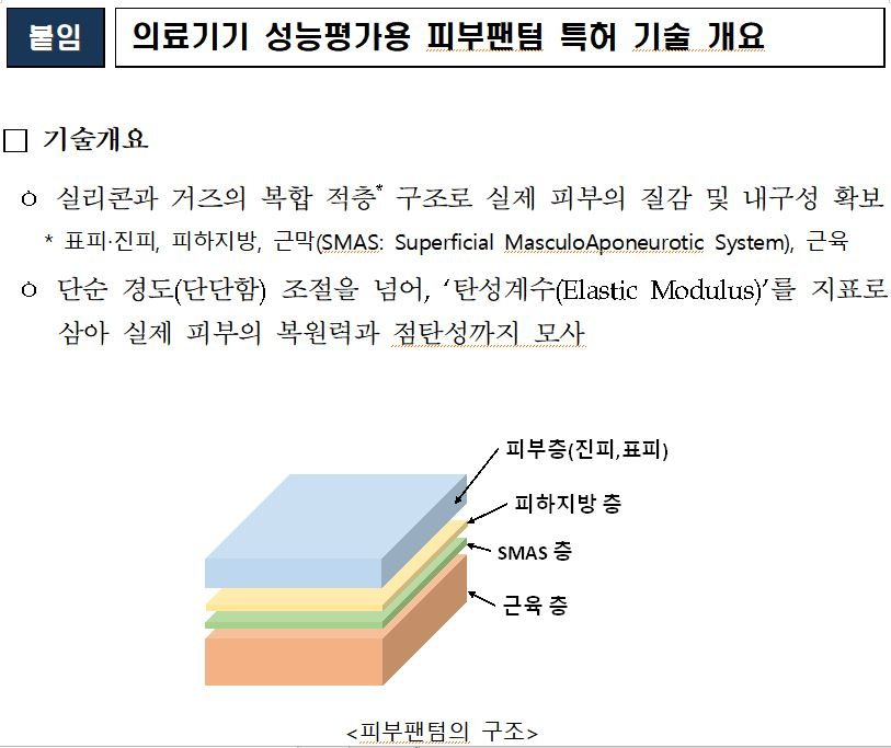 이번에 개발된 인공피부모델은 실리콘 등을 활용해 피부 겉층(표피, 진피), 피하지방, 근막, 근육 등 주요 조직을 적층구조로 재현해 인체 피부와 유사한 복원력과 점탄성을 모사한 것이 특징이다.