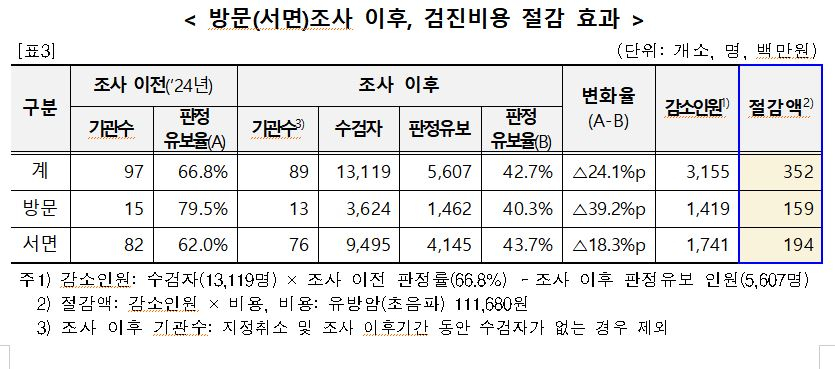 공단 조사 이후 판정유보율은 감소했다. 지난해 9월2일~11월30일 판정유보율을 분석한 결과 대상기관(97개소)의 평균 판정유보율은 2024년 66.8%에서 42.7%로 24.1%포인트(p) 개선됐다. 이에 따라 판정유보 인원도 3155명 감소했다. 그 효과로 유방초음파 검사비 3억5200만원 절감이 발생한 것으로 산출됐다.