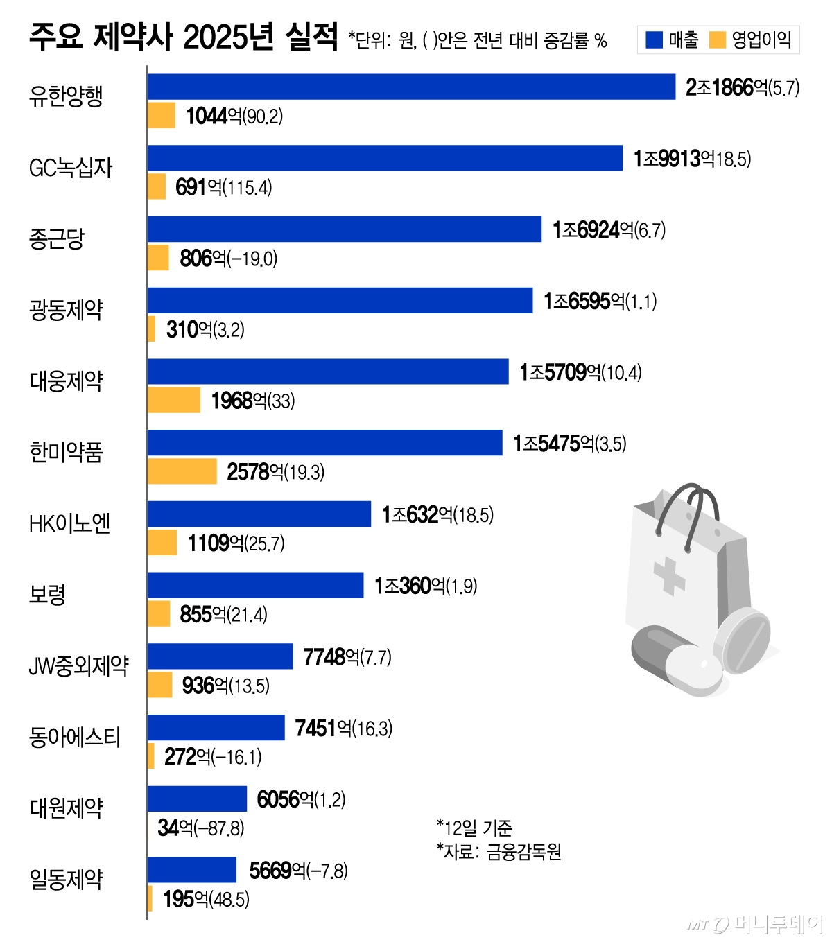 이밖에 보령(9,560원 ▼110 -1.14%), JW중외제약(33,550원 ▲300 +0.9%), 동아에스티(53,700원 ▼200 -0.37%), 대원제약(11,770원 ▲20 +0.17%) 등도 매출이 증가했다. 다만 연구개발비 증가 등으로 일부 영업이익이 감소했다. 일동제약(36,600원 ▼450 -1.21%)은 바이엘코리아와의 공동 판매 계약 종료로 지난해 매출이 줄었지만 영업이익이 비용 효율화로 증가했다. 올해 신약 개발 성과를 내겠다는 게 목표다.
