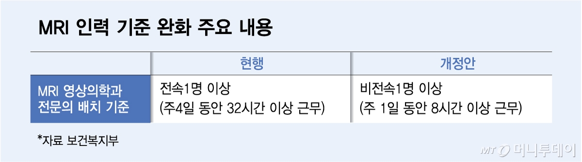 현행 시행규칙에서는 MRI를 설치·운영하는 의료기관은 영상의학과 전문의가 주 4일, 32시간 이상 전속으로 근무해야 한다. 환자 안전과 고가 장비인 MRI의 오남용을 막기 위한 목적이었다.