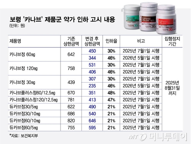 앞서 복지부는 지난해 6월 카나브 제품군의 약가를 지난해 7월부터 최대 48% 인하하겠다고 고시했다. 카나브 30㎎ 약가를 439원에서 307원으로, 60㎎는 642원에서 450원으로, 120㎎는 758원에서 531원으로 각각 인하한다고 했다.