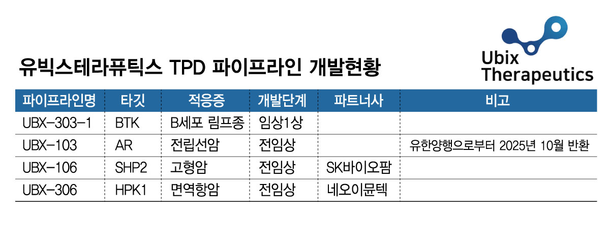 유빅스테라퓨틱스는 표적단백질분해제(TPD)와 이를 기반으로 한 분해제-항체접합체(DAC)를 개발하고 있다. 현재 B세포 림프종을 적응증으로 BTK 타깃 파이프라인 'UBX-303-1'의 글로벌 임상 1상을 직접 진행하고 있다. TPD는 아직 상용화되지 않은 신규 모달리티(치료접근법)인 만큼 국내 기업 중 처음으로 임상에 진입했다는 것 자체가 큰 성과로 평가받고 있다.
