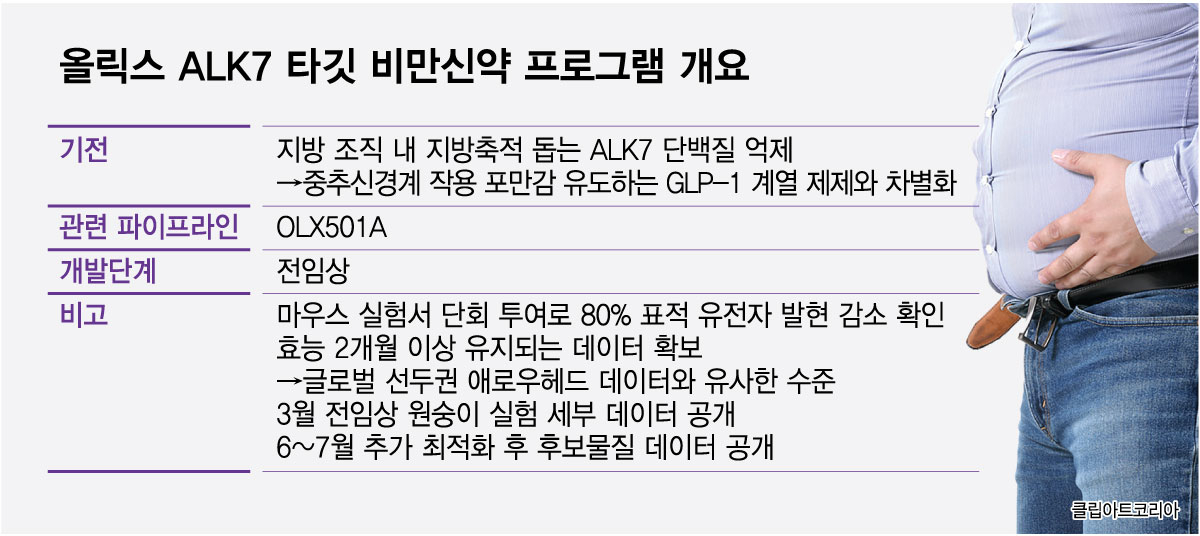 4일 올릭스에 따르면 이 회사는 이달과 올 하반기 두 차례에 걸쳐 비만 신약 차세대 기전인 ALK7 타깃 치료제 'OLX501A' 관련 데이터를 잇따라 발표할 예정이다. 앞서 글로벌 선두권 업체와 동등한 수준의 데이터를 확보한데 이어, 우위를 점할 수 있는 경쟁력 입증을 자신하는 중이다. 이를 기반으로 조기 글로벌 기술이전 추진에 나선다는 전략이다.