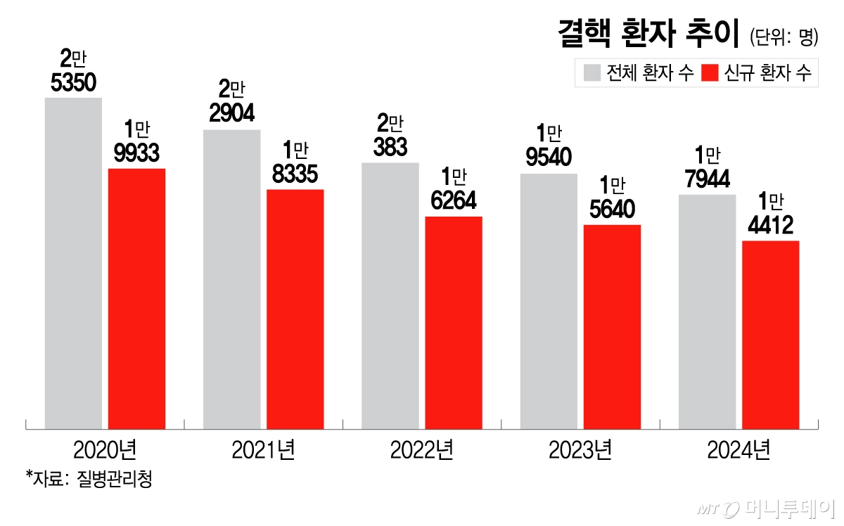 12일 질병청에 따르면 2024년 우리나라 전체 결핵 환자는 1만 7944명으로 이 중 1만 4412명이 신규 환자다. OECD 회원국 중 '발병률 1위'의 오명은 벗었지만 여전히 발생률 2위, 사망률 3위(2024년 기준)로 환자가 적지 않은 실정이다.