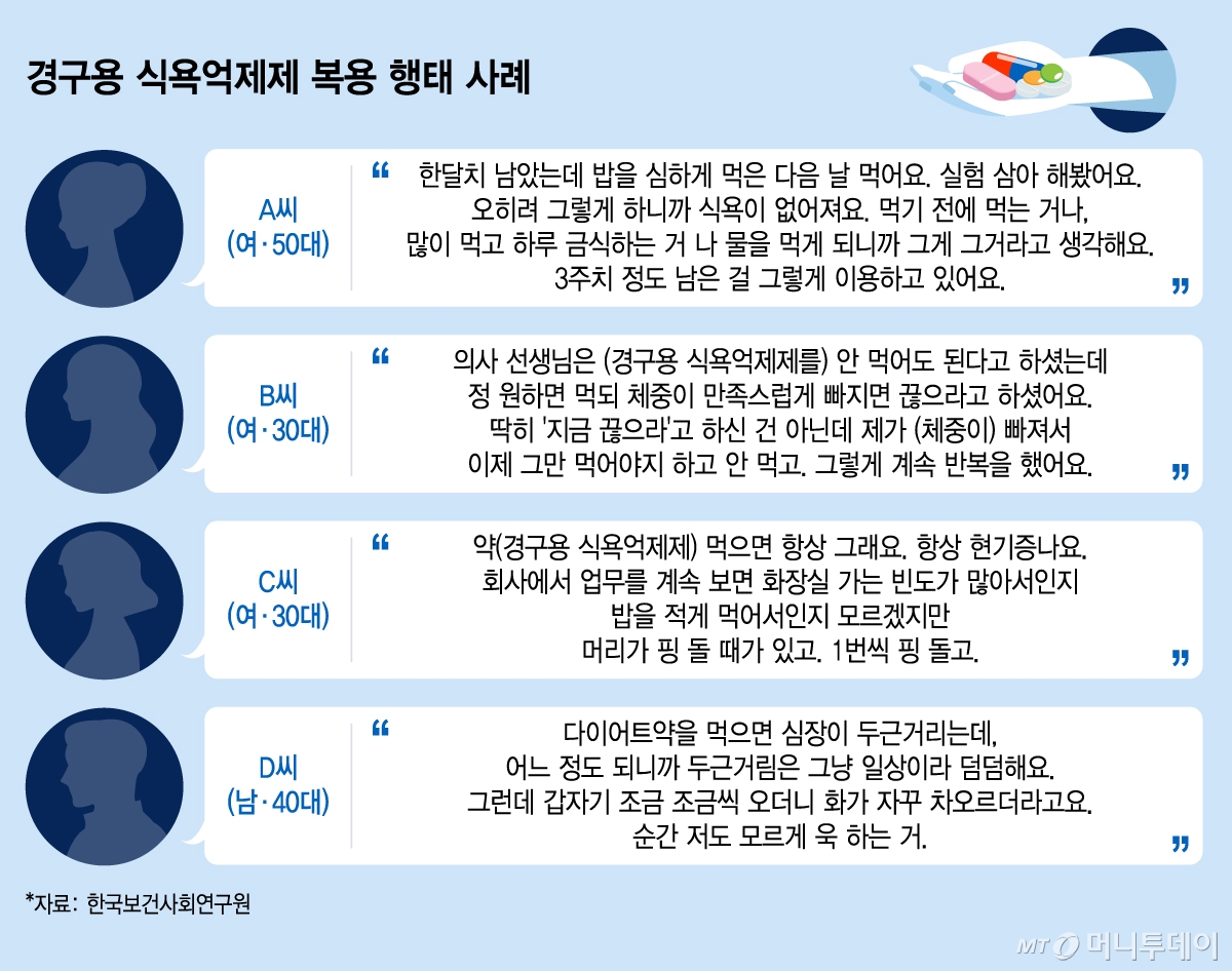 "보통 폭식한 다음 날 먹어요. 아침에 먹고 종일 굶죠. 그럼 식욕이 없어지니까." (한국보건사회연구원 의약품 남용 연구 참여자 A씨)