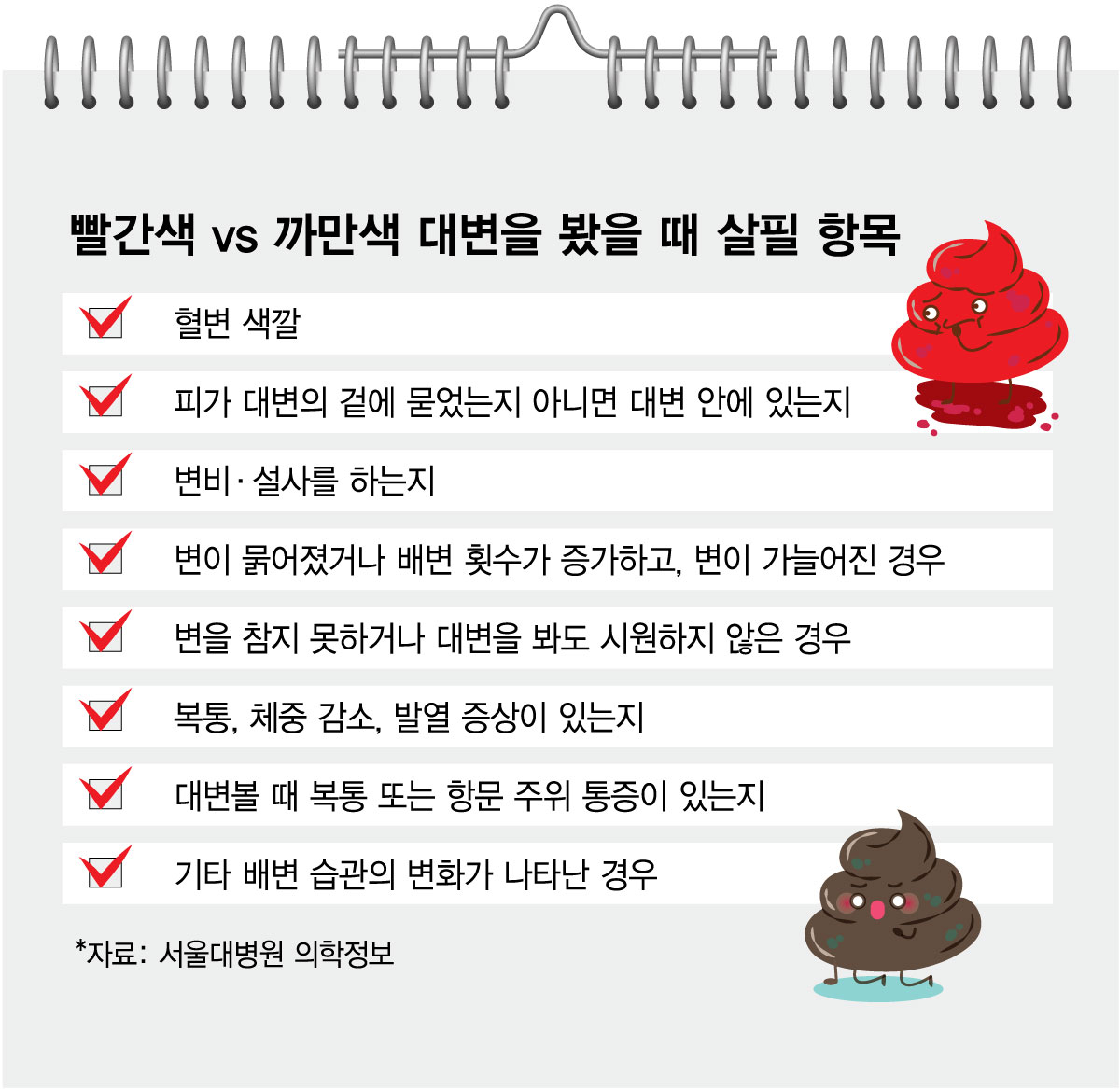빨갛거나 까만 대변을 봤다면 동반 증상이나 이상 징후가 있는지 살피고, 이를 의사에게 알려야 한다. 예컨대 △피가 대변의 겉에 묻어 있는지, 아니면 대변 속에 피가 있는지 △변비·설사를 하는지 △대변이 묽어졌거나 배변 횟수가 증가하고, 변이 가늘어졌는지 등이다.