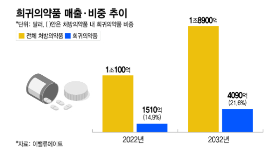 17일 한국바이오협회와 글로벌 의약품 시장조사기관 이밸류에이트에 따르면 오는 2032년 글로벌 희귀의약품 매출액은 4090억달러(약 611조원)로 전체 처방의약품 매출(1조8900억달러)의 21.6%를 차지할 전망이다. 지난 2022년엔 15% 수준이었다는 점을 감안할 때 주목할 만한 성장세다.