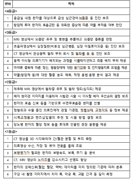 예컨대 응급실 내원 환자를 대상으로 급성 심근경색·뇌졸중 등 진단을 보조하는 의료기기는 4등급이다. MRI 영상으로 뇌종양 종류를 판정하는 의료기기는 3등급, 시험관 시술 시 이식할 배아 우선순위 결정을 보조하는 의료기기는 2등급, 환자의 보행속도, 보폭, 주기 등을 분석하는 의료기기는 1등급이다.