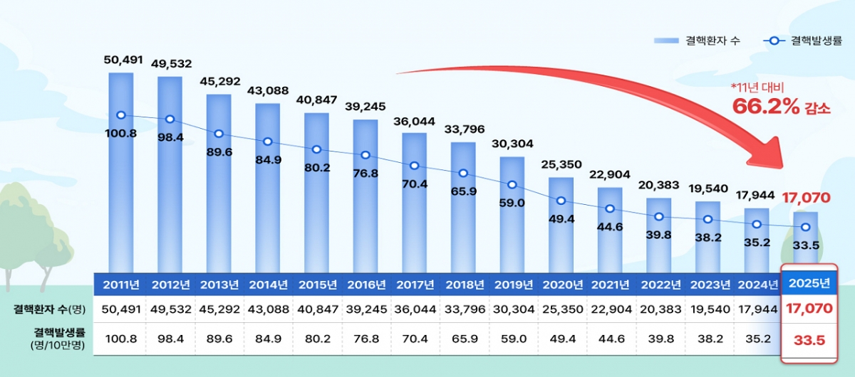 24일 질병관리청이 제16회 결핵 예방의 날을 맞아 발표한 '2025년도 결핵 환자 신고현황'에 따르면 지난해 국내 결핵 환자 수는 1만7070명으로 전년 대비 4.9% 감소했다. 최고치였던 2011년(5만491명) 이후 지난 14년간 연평균 7.5%씩 줄어 누적 66.2% 감소한 수치다.