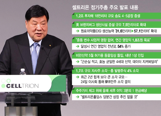 셀트리온은 이날 주총 시작 전 1조2265억원을 투자해 총 18만리터 규모의 송도 4·5공장 증설을 단행한다고 밝혔다. 4·5공장에는 최첨단 자동화 시스템과 스마트 팩토리 기술 적용은 물론, 로봇 투입도 고려된다. 또 당초 6만6000리터였던 미국 브랜치버그 생산시설 증설 규모 역시 늘어난 7만5000리터로 확정했다.
